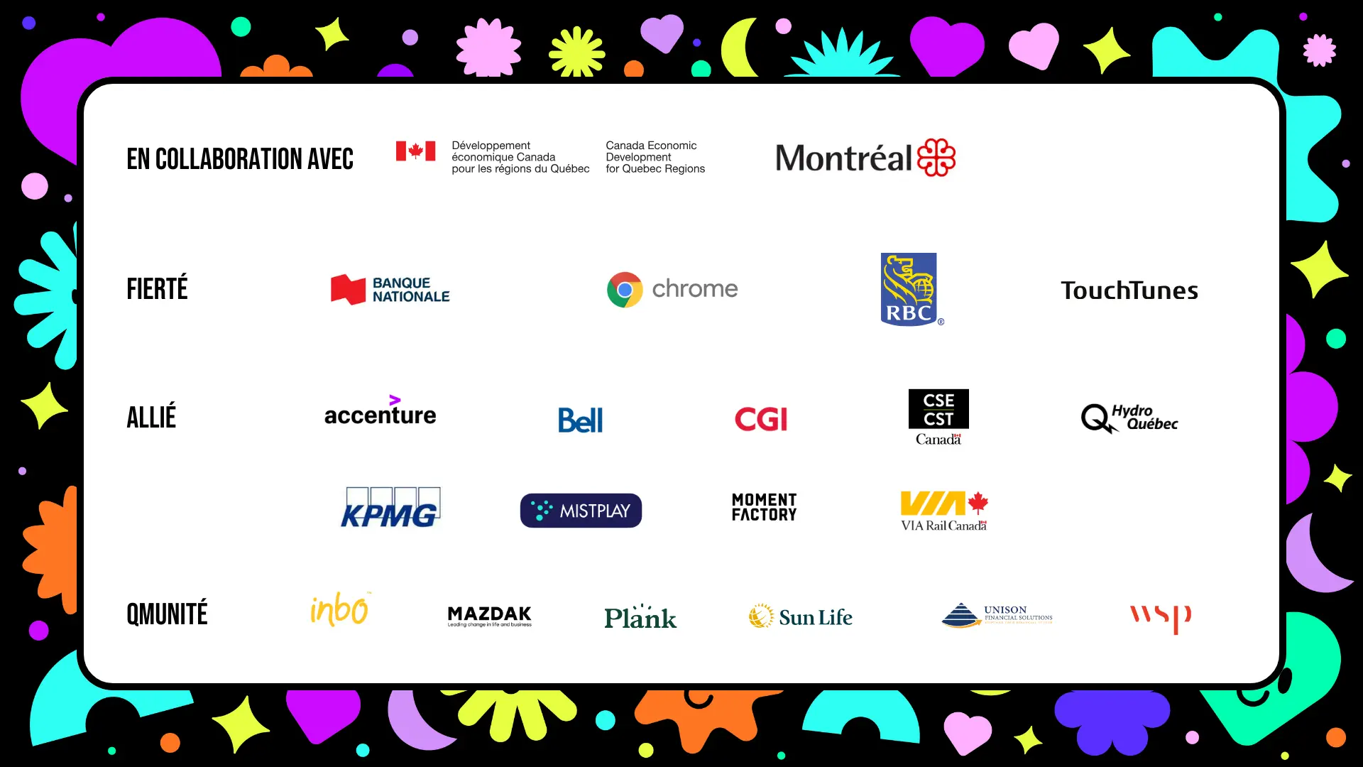 (En collaboration avec) Développement économique Canada pour les régions du Québec, Ville de Montréal, (Fierté) Banque Nationale, Google Chrome, RBC, TouchTunes (Allié) Accenture, Bell, CGI, CSE CST, Hydro Québec, KPMG, Mistplay, Moment Factory, Via Rail, (Qmunité) INBO, Mazdak Coaching, Plank, Sun Life Financial, Unison Financial Solutions, WSP, (Sponsor virtuel) BC Public Service, (Sponsor de la session) Lighthouse Labs